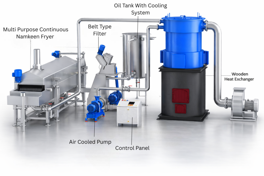 The Multi Purpose Continuous Namkeen Fryer is an advanced, fully automated solution designed for high-capacity snack production with consistent quality and efficiency. Engineered to handle a wide variety of namkeen and snack products, this system ensures continuous frying with precise control over temperature, oil quality, and frying time.