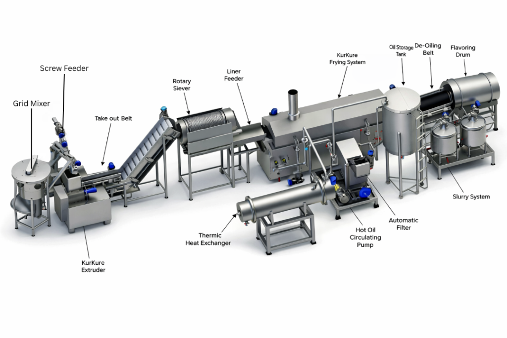 The Kurkure Frying Line is a fully automated, high-performance system designed for the continuous production of extruded snacks like Kurkure, corn curls, and similar puffed products. This advanced line integrates extrusion, frying, de-oiling, seasoning, and cooling into a seamless process, ensuring consistent quality, superior crunch, and enhanced flavor in every batch.